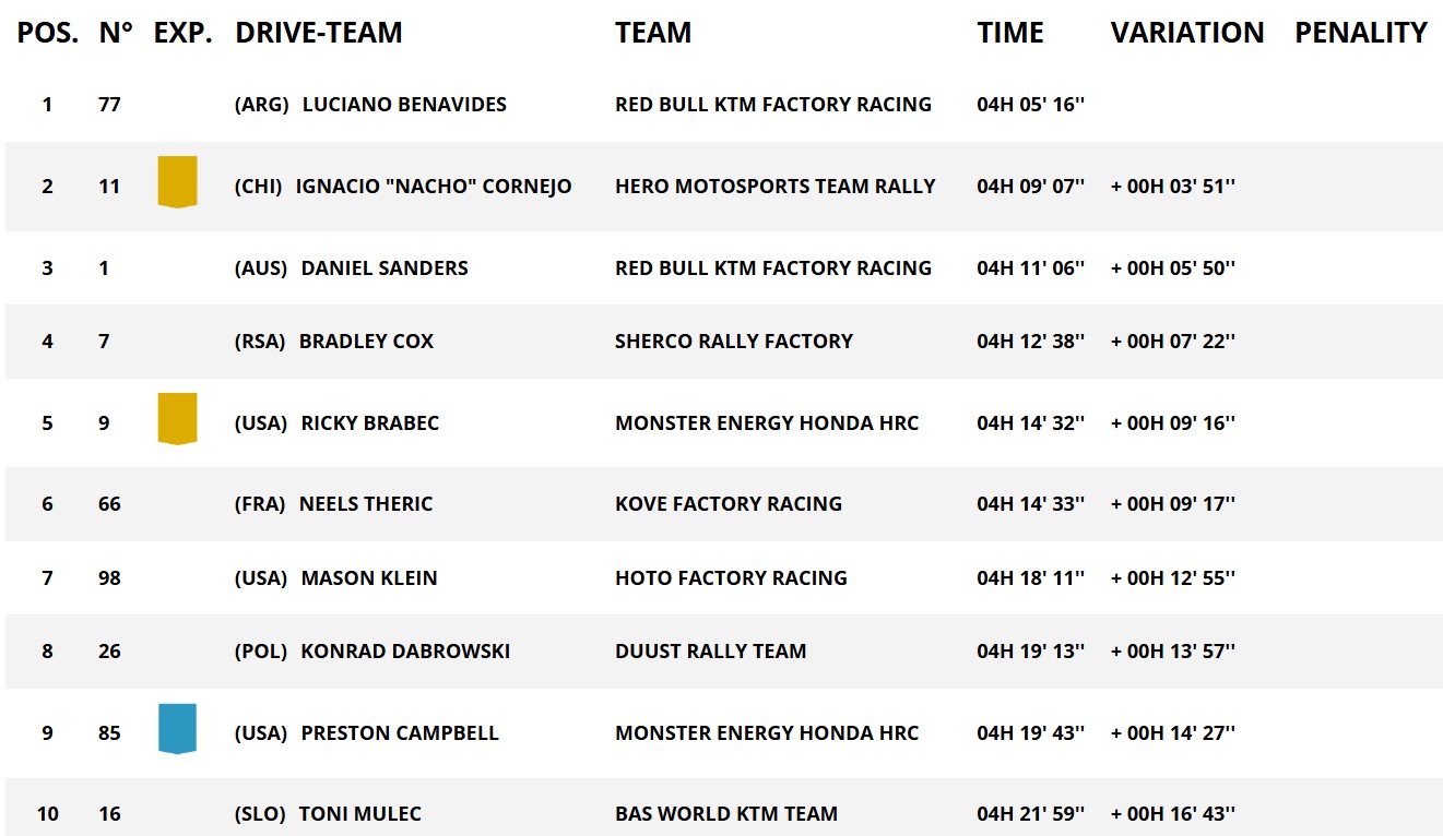 Die Sonderprüfung ermöglichte auch zwei anderen Fahrern ihre besten Leistungen der Woche: Nacho Cornejo belegte auf seiner Hero den 2. Platz, 3'51'‚ hinter Benavides, während Bradley Cox 7'22‘' hinter dem Tagessieger auf Platz 4 landete und damit seine beste Leistung in fünf Teilnahmen an der Dakar (erreicht auf der 1. Etappe 2024) egalisierte.