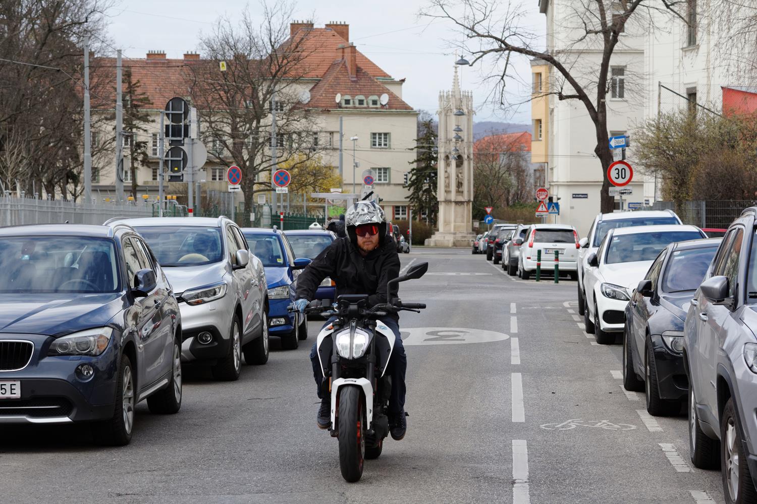 Ein Start bei Temperaturen unter dem Gefrierpunkt ist kein Problem. Die KTM springt sofort an. Allerdings: Beim Anrollen an die erste Ampel, stirbt sie ohne künstliche Drehzahlerhöhung ab. Und das jedes Mal.