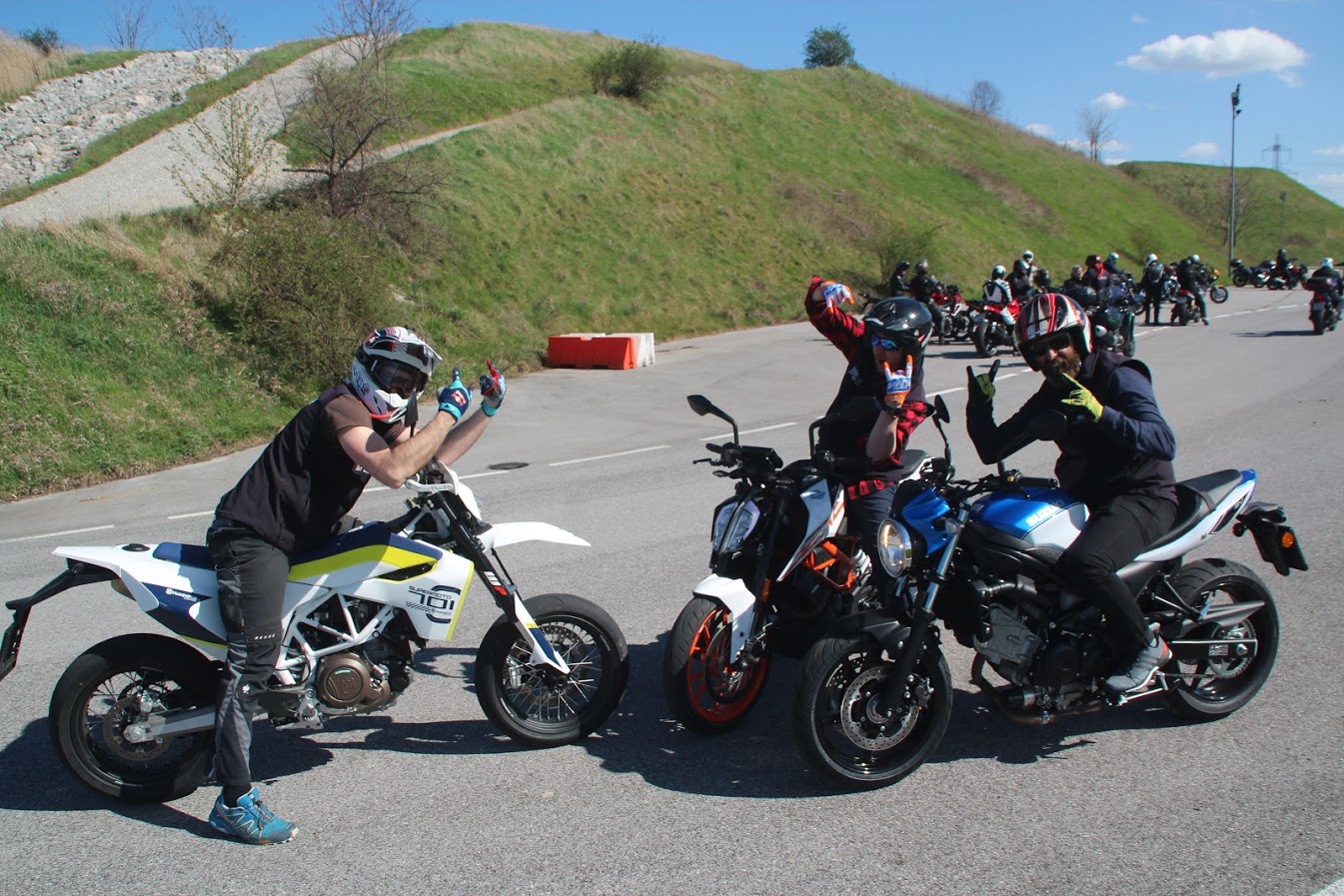 Hinnageln zur Kurve ist ein Mordsspaß. Vom 4er auf den 2 schalten mit der ganzen Bremsleistung. Vorderradbremse voll, hintere Bremse voll und Motorbremse dosiert halbvoll, bedeutet quer reinfahren. Ein echtes Fahrvergnügen. Der Supermoto Mode ist perfekt für uns abgestimmt.