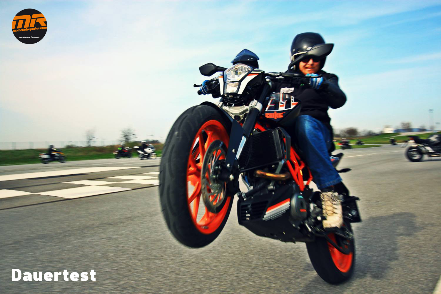 Die KTM 390 ist das bevorzugte Stuntgerät von Rok Bagoros, dem KTM Stuntfahrer. Somit ist alles gesagt. Der erste Gang ging mit der Standardübersetzung sehr scharf aufs Hinterrad, der dritte Gang nur mit sehr viel Kupplungseinsatz. Der zweite Gang war nach einer gewissen Übungszeit sehr leicht und überschaubar machbar.