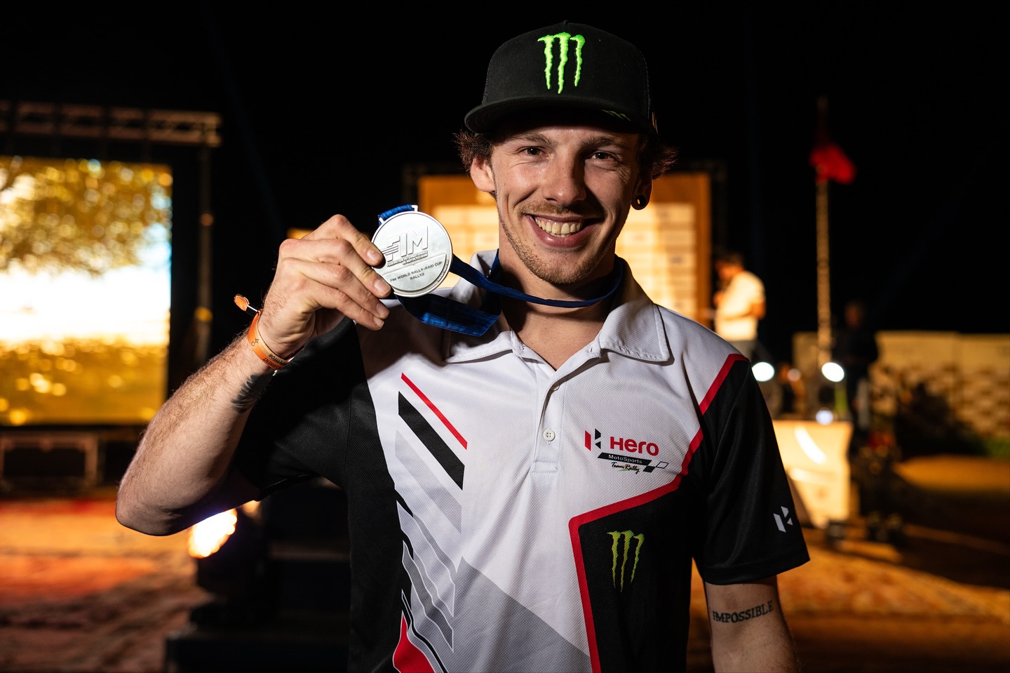 Das Heromotorsports-Team hat die ganze Saison alles gegeben, damit ich mich so wohl am Motorrad wie möglich fühle. Leider bin ich eine Woche vor der Rally krank gewesen, wodurch ich leider die Zeit im Hotel verbringen musste und nicht in der Wüste zum trainieren…es war spannend bis zum Schluss, aber am Ende hats um 49 Sekunden gereicht, dass ich um 1 Punkt Vizeweltmeister in da R2 geworden bin. Spannung pur! Jetzt läuft die Vorbereitung zur DAKAR und ich bin voller Energie!"