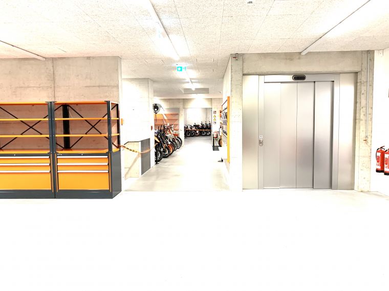 Der Motorrad Prüfraum ist an den Wänden Schallgedämpft, am Boden schwingend gelagert, so das die Kunden um Erdgeschoss ungestört shoppen können!