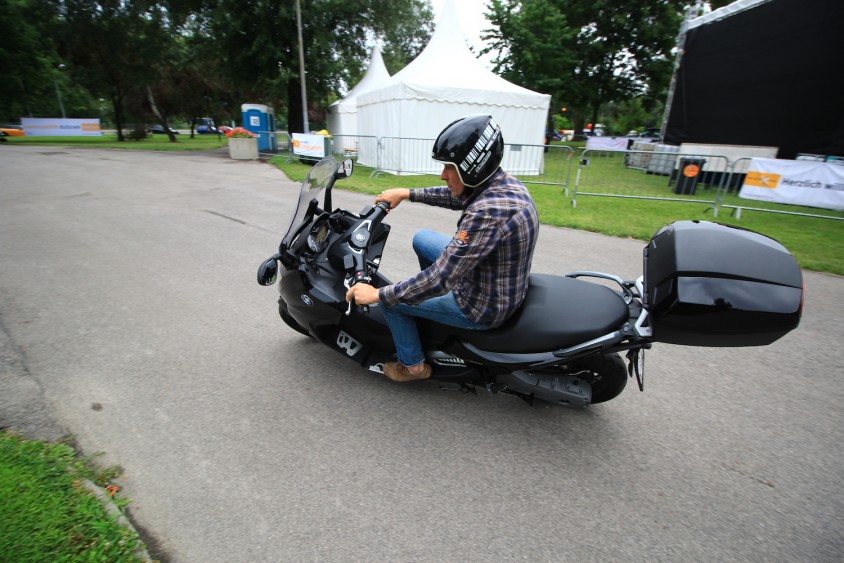 Die reichliche Schräglagenfreiheit der C-Scooter liegt auf Motorradniveau. An den Hauptständern sind sogar jeweils Schleifnippel angebracht, um das Ende des Vergnügens anzuzeigen. Auf landstraßenüblichem Asphalt ist man hier auch schon an der Rutschgrenze. Bei der Reifendimension (vorne und hinten 15 Zoll), dem langen 1591-Millimeter-Radstand und anderen fahrwerksgeometrischen Daten hat BMW nichts Neues erfunden – also ist die Fahrpräzision und das direkte Handling vor allem den hochwertigen Federungskomponenten und dem stabilen Stahlrohr-Brückenrahmen zuzuschreiben.