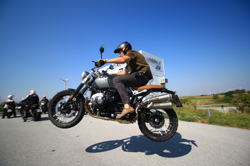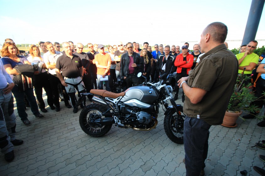 Safebike Schirmherr und Erzbergrodeo Macher, Karl Katoch, zeigt den Teilnehmern vorab die Be - und Entlastung der Federelemente des neuen BMW Scramblers. Er ist ein mündiger Bürger und entscheidet selber, wann er Schutzbekleidung anzieht. Helm und Handschuhe sind bewusst gewählt.